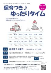 イベント情報 イベント保育つきゆったりタイム(2026年度)開催日毎月第2週の火曜日10:00~12:00 イベントおはなしゆめじかん(2026年度)開催日毎月第4週の火曜日10:30~11:00イベント一覧