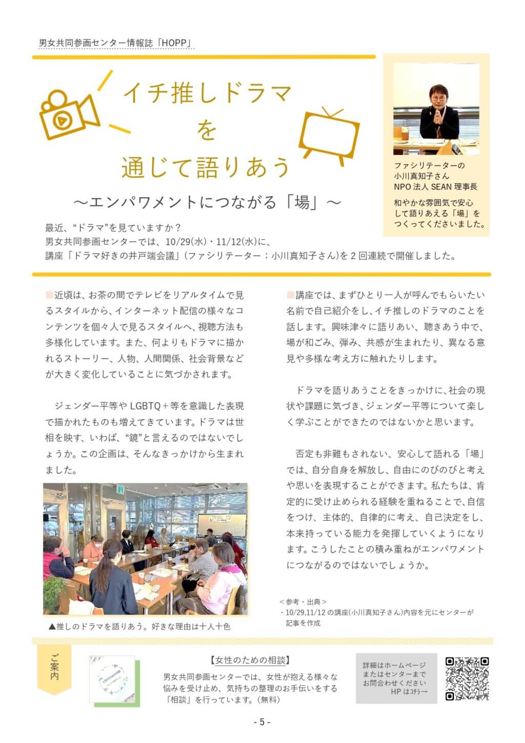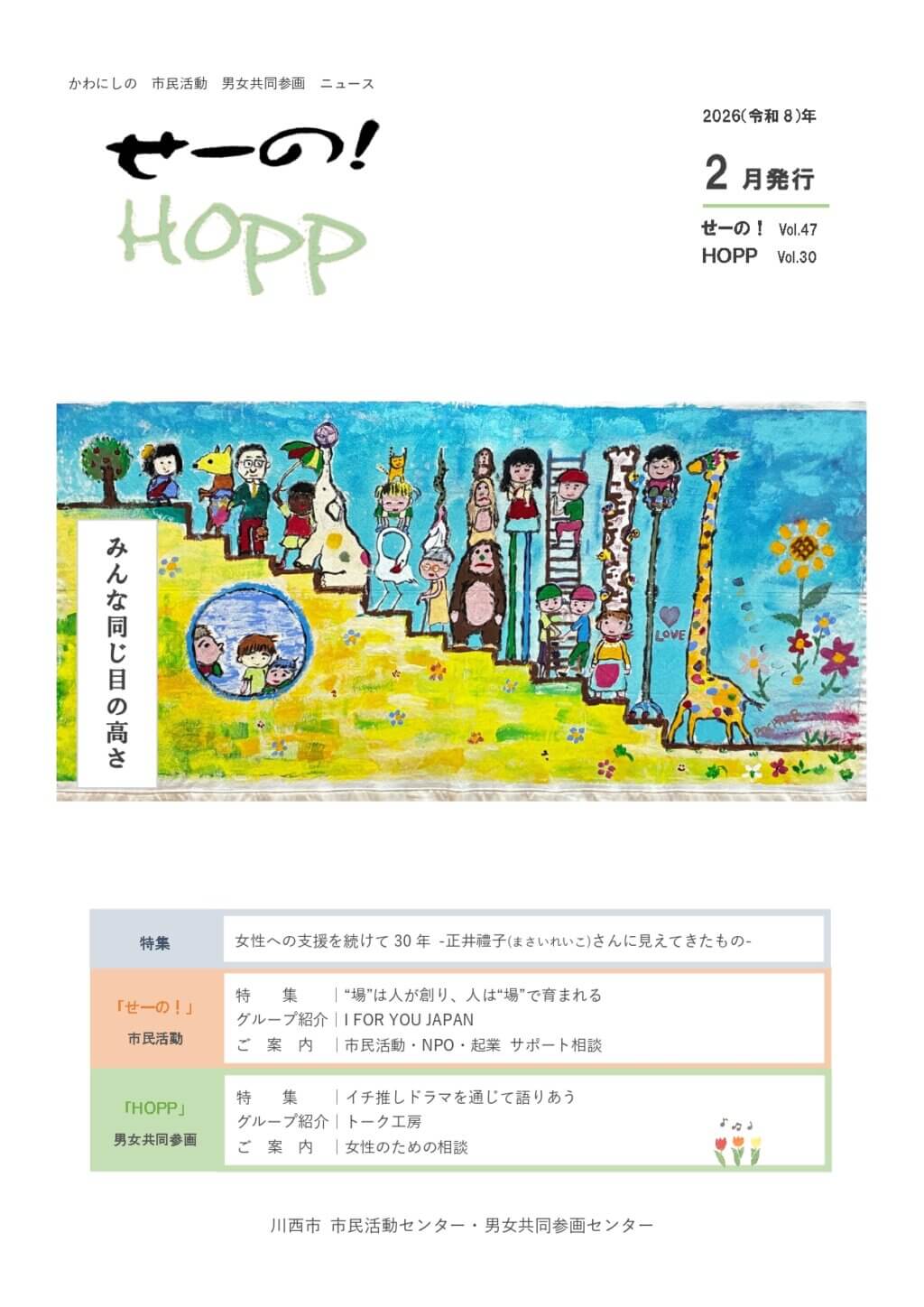 2026/02/25お知らせ市民活動男女共同参画センター情報誌(2月号)を発行しました情報誌は市内外の公共施設などに設置しています。ぜひお手に取ってご覧ください。<特集>女性への支援を続けて30年 -正井禮子(まさいれいこ)さんに見えてきたもの-<せーの!(市民活動)>特集|“場”は人が創り、人は“場”で育まれるグループ紹介|I FOR YOU JAPANご案内|市民活動・NPO・起業 サポート相談<HOPP(男女共同参画)>特集|イチ推しドラマを通じて語りあうグループ紹介|トーク工房ご案内|女性のための相談※掲載されている記事等の無断転載はご遠慮ください