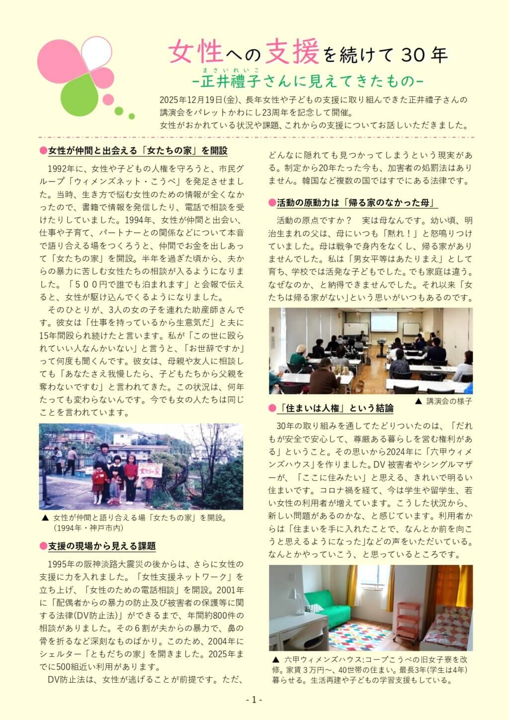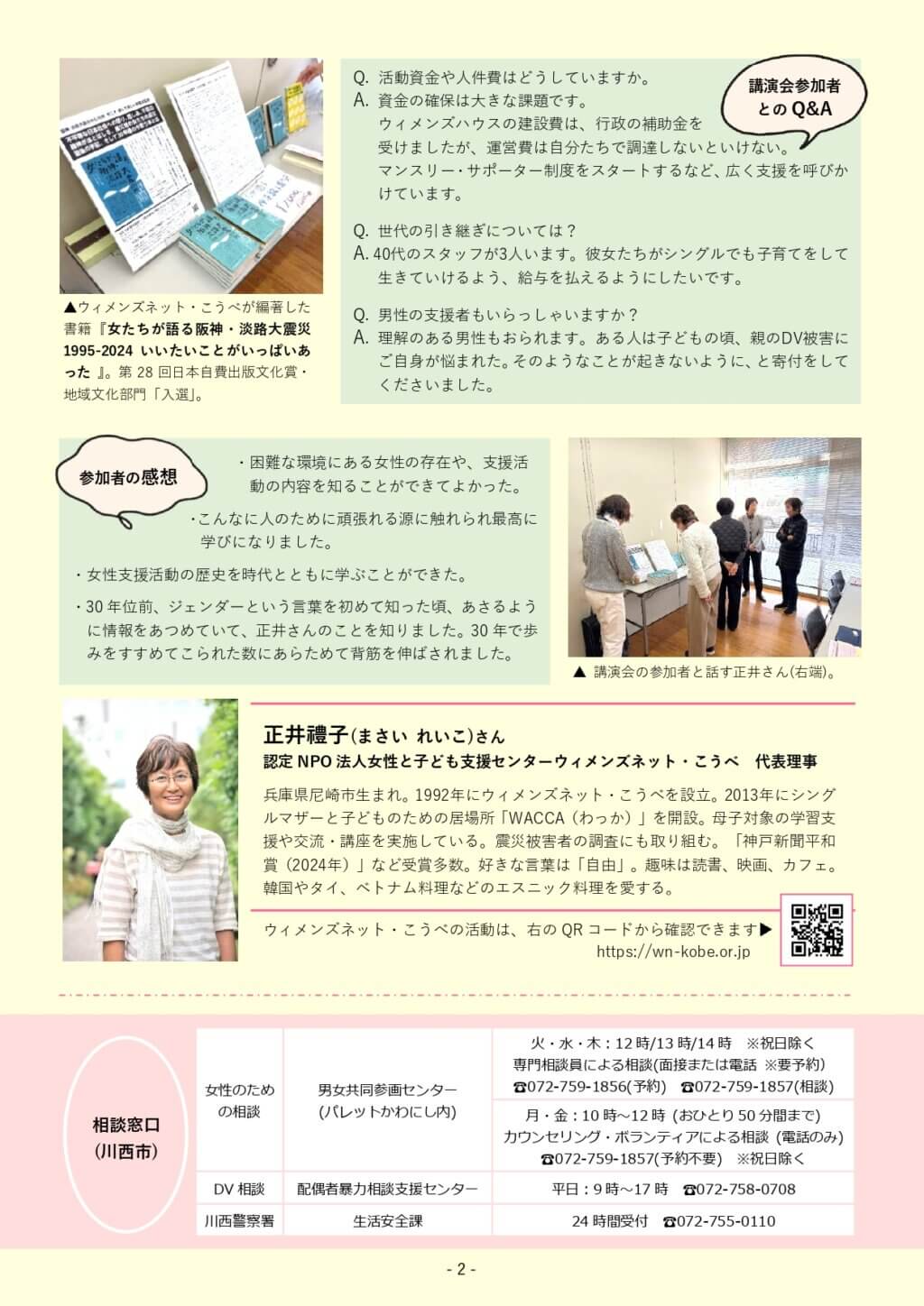 newsお知らせ HOME > お知らせ > センター情報誌(2月号)を発行しました2026/02/25お知らせ市民活動男女共同参画センター情報誌(2月号)を発行しました情報誌は市内外の公共施設などに設置しています。ぜひお手に取ってご覧ください。<特集>女性への支援を続けて30年 -正井禮子(まさいれいこ)さんに見えてきたもの-<せーの!(市民活動)>特集|“場”は人が創り、人は“場”で育まれるグループ紹介|I FOR YOU JAPANご案内|市民活動・NPO・起業 サポート相談<HOPP(男女共同参画)>特集|イチ推しドラマを通じて語りあうグループ紹介|トーク工房ご案内|女性のための相談※掲載されている記事等の無断転載はご遠慮ください
